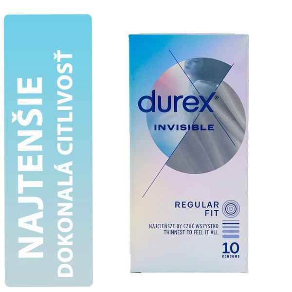 Durex Invisible Superthin – ultra tenké latexové kondómy. Používajte s lubrikantom na vodnej báze.
