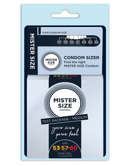 3 rôzne veľkosti – ideálne na vyskúšanie!Mister Size je špeciálne vyrobená značka kondómov, ktorá poskytuje bezpečný a pohodlný pocit. Tento stredný testovací balíček obsahuje 3 kondómy šírky 53 mm, 57 mm a 60 mm, ktoré sú vhodné pre obvod penisu od 10,5 cm do 14,5 cm. Určite nájdete tu ten správny rozmer kondómu pre vás!Všetky 3 kondómy sú priehľadné, super te