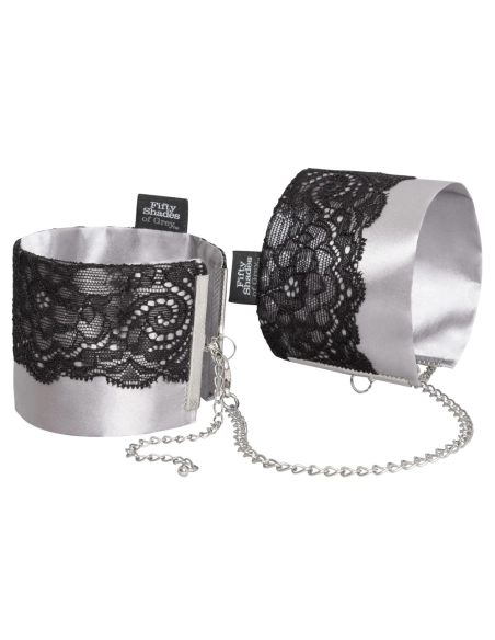 Nový člen série A Szürke ötven árnyalata chce byť súčasťou tvojej zbierky!Zmyselné, strieborné saténové putá, zdobené jemnou čiernou čipkou.