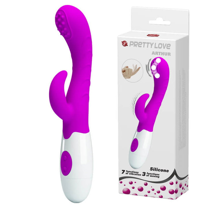 Pretty Love Arthur dvojitý vibrátor s rotačnými guľôčkami na špičke. Oplachuodolný, umývaj teplou vodou a jemným mydlom.