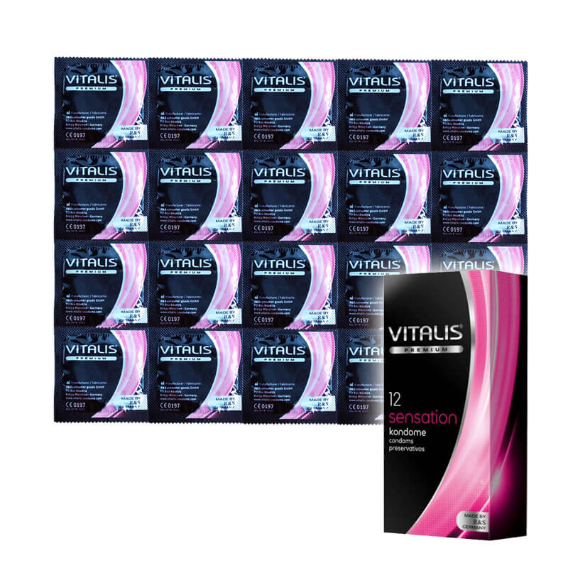 Vitalis Sensation vrúbkované kondómy s dráždivými bodkami. Vyrobené z prírodného latexu ružovej farby. Anatomicky tvarované zakončené rezervoárom.