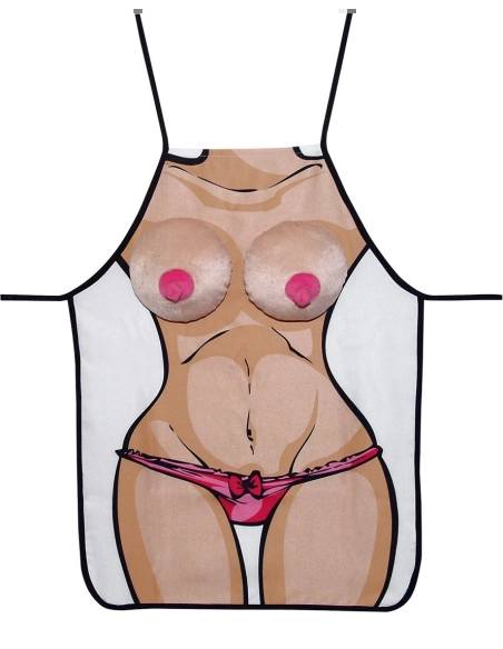 Biela zástera s čiernym lemovaním, ktorá sa viaže okolo krku a má zaväzovací pás na bokoch. Na zástere je skutočne zvodná a hravá kreslená ženská postava s plnými, vypuklými, plyšovými prsiami a vztýčenými bradavkami. Nikto sa neudrží, aby sa jej nedotkol. Materiál: 100% Polyester.